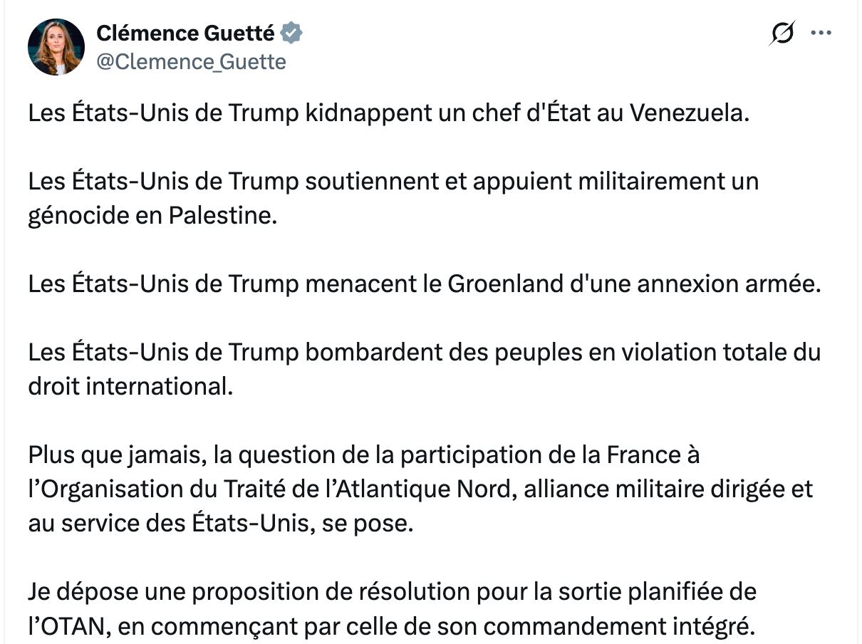 "Сполучені Штати Трампа викрадають главу держави у Венесуелі. Сполучені Штати Трампа підтримують і надають військову допомогу геноциду в Палестині. Сполучені Штати Трампа загрожують Гренландії збройною анексією. Сполучені Штати Трампа бомбять народи в повному порушенні міжнародного права. Північноатлантичний договір, військовий альянс, який очолює США і служить їх інтересам. Я вношу пропозицію про резолюцію щодо планового виходу з НАТО, починаючи з її інтегрованого командування", - заявила Гетте.