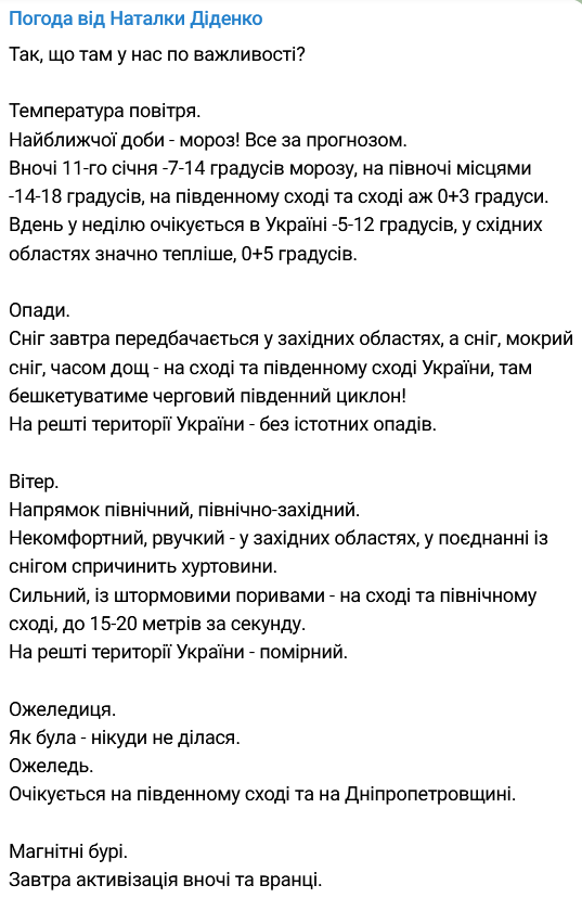 "Вночі 11 січня -7...-14 градусів, на півночі місцями -14...-18 градусів, на південному сході та сході до 0...+3 градусів. Вдень у неділю в Україні очікується -5...-12 градусів, у східних областях значно тепліше - 0...+5 градусів. Завтра сніг очікується у західних областях, а сніг, мокрий сніг та часом дощ - на сході та південному сході України, там активнічатиме черговий південний циклон! На решті території України – без істотних опадів. Напрямок північний, північно-західний. Незручний, рвучкий - у західних областях, у поєднанні зі снігом викличе хуртовини. Сильний, із штормовими поривами – на сході та північному сході, до 15–20 м/с. На решті території України – помірний. Гололед. Як був – нікуди не подівся. Очікується на південному сході та у Дніпропетровській області. Магнітні бурі. Завтра активізація вночі та вранці. У Києві 11 січня без снігу, з ожеледицею та морозом. Вночі -16, за проясненнями до -18 градусів, вдень у неділю -10...-12 градусів", - пише синоптик.