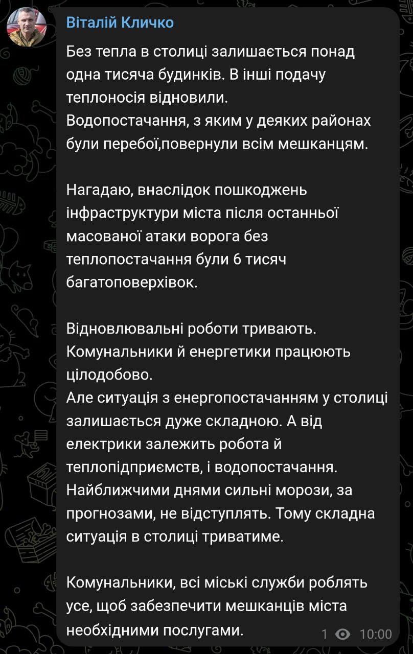 При цьому мер Києва Віталій Кличко підтвердив, що у столиці без тепла залишаються понад тисячу будинків. Водопостачання з перебоями в окремих районах відновили для всіх мешканців.