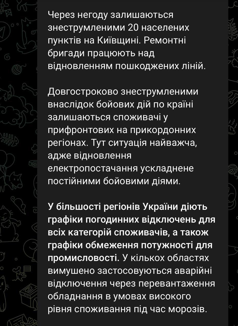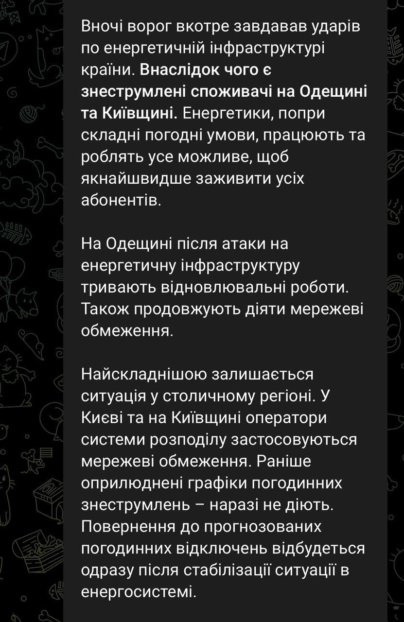 У Міненерго також заявили, що після сьогоднішніх обстрілів було знеструмлено споживачів в Одеській та Київській областях. У низці регіонів також діють аварійні відключення.