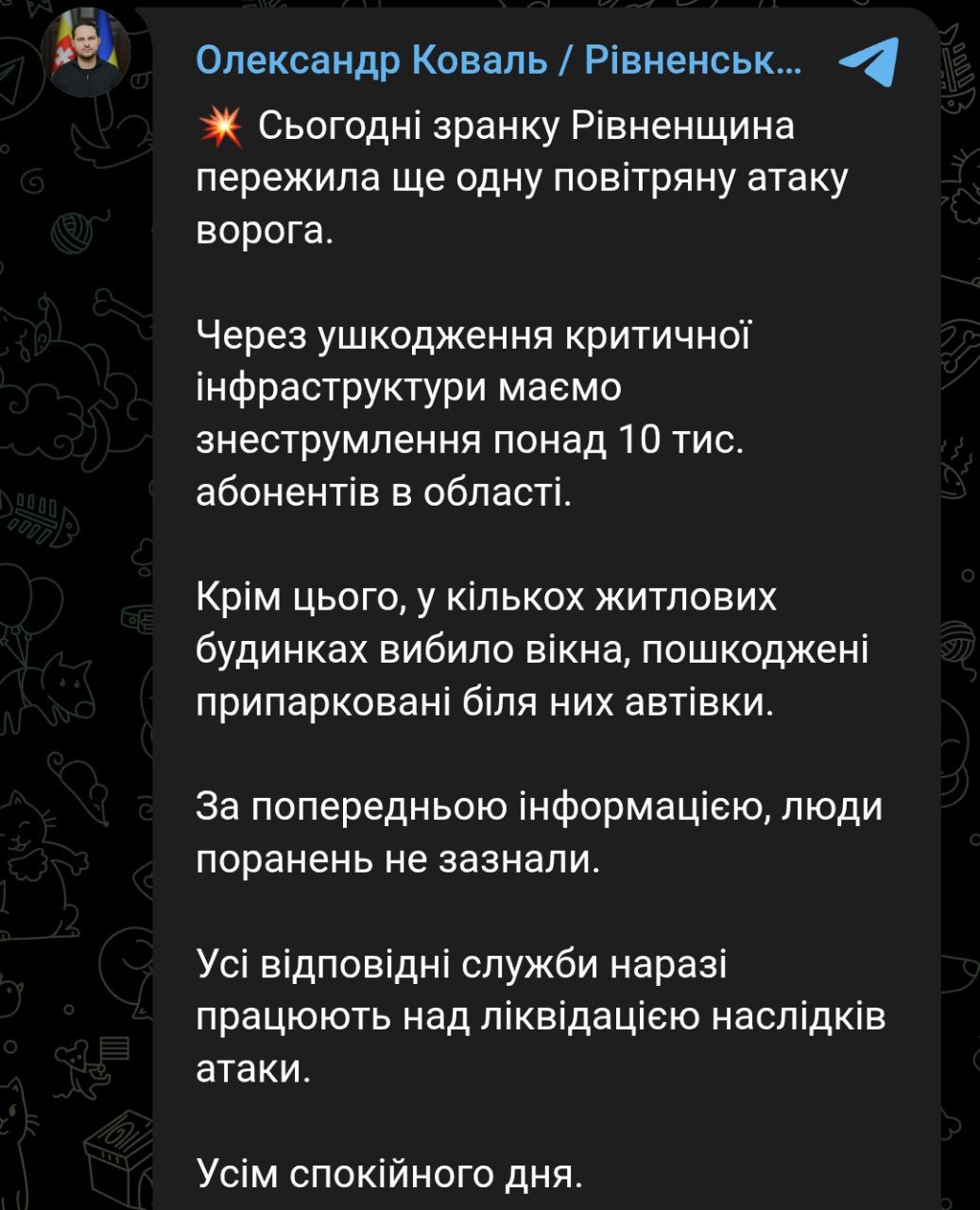 - на Рівненщині після пошкодження об'єкта критичної інфраструктури без світла залишилося понад 10 тисяч людей.