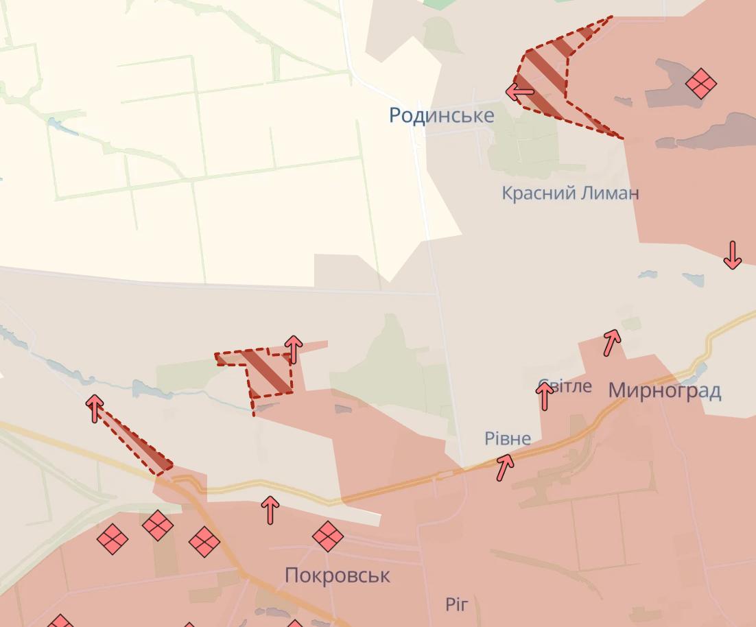 10.44 Армія РФ знову просунулась у Покровську і на північ від Мирнограда, а на північ від Гуляйполя захоплено село Рибне, повідомляє Deep State.