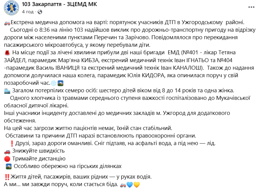 Про це повідомила прес-служба Закарпатського центру екстреної медичної допомоги та медицини катастроф на своїй сторінці у Facebook.