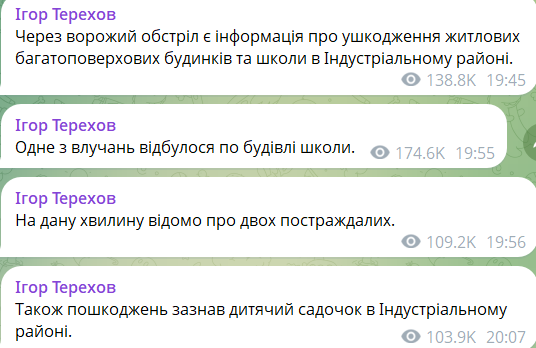 Про це повідомив мер міста Ігор Терехов у своєму телеграм-каналі.