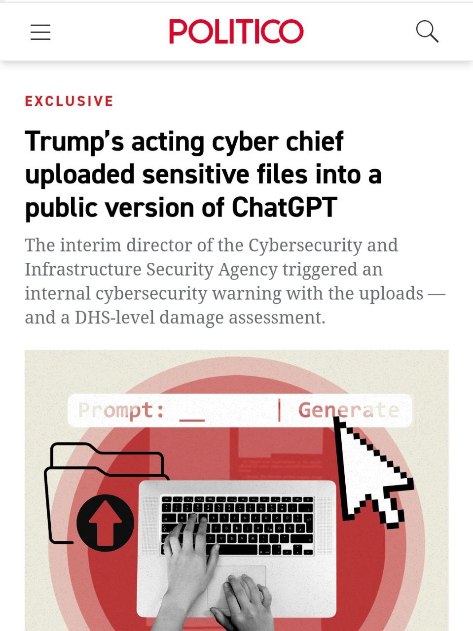 Глава Агентства кібербезпеки США (CISA), яке відповідає, серед іншого, за боротьбу з хакерами з Росії та Китаю, Мадху Готтумуккала завантажив конфіденційні документи у діалог із ChatGPT. Подія сталася влітку 2025 року.