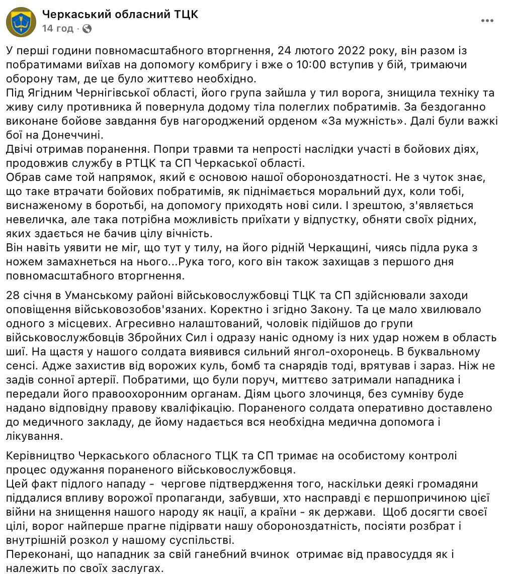 "28 січня в Уманському районі військовослужбовці ТЦК і СП проводили заходи щодо оповіщення військовозобов'язаних. Коректно і згідно із законом. Але це мало хвилювало одного з місцевих. Агресивно налаштований чоловік підійшов до групи військовослужбовців Збройних сил і одразу завдав одному з них удару ножем у область шиї. На щастя, у нашого бійця був сильний ангел-охоронець... Ніж не влучив у сонну артерію. Товариші, які перебували поруч, миттєво затримали зловмисника та передали його правоохоронним органам. Дії цього злочинця безперечно отримають відповідну правову кваліфікацію. Пораненого бійця оперативно доставили до медичного закладу, де йому надали всю необхідну медичну допомогу та лікування», – йдеться в публікації.