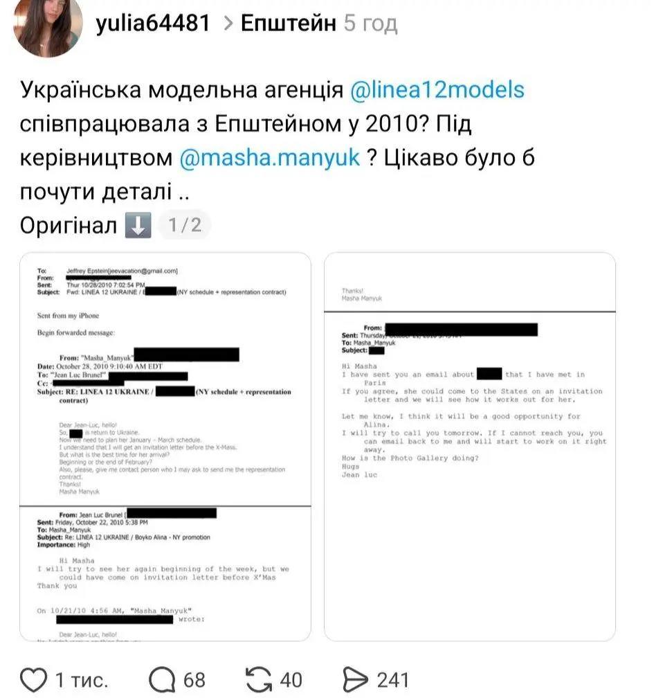 Манюк вже спростувала звинувачення та заявила, що не відправляла Брюнелю українських моделей на острів Епштейна для сексуальних втіх, а це було звичайне професійне листування та презентація моделей закордонним агентствам.