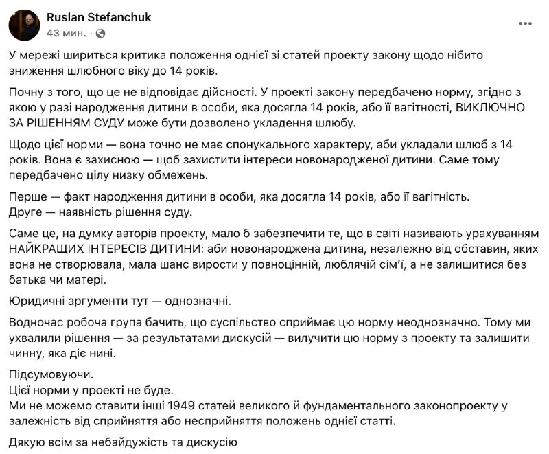 "Ця норма точно не має спонукального характеру, щоб укладати шлюб з 14 років. Вона є захисною — щоб захистити інтереси новонародженої дитини. Саме тому передбачено цілу низку обмежень. Щоб новонароджена дитина незалежно від обставин, які вона не створювала, мала шанс вирости у повноцінній, люблячій сім'ї, а не залишитися без батька або матері. Юридичні аргументи тут однозначні. цю норму неоднозначно. Тому ми ухвалили рішення — за результатами дискусій — виключити цю норму із проекту та залишити поточну, яка діє зараз", - написав Стефанчук.