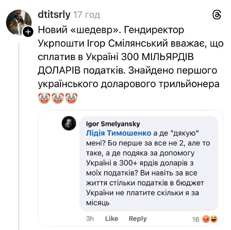 "Новий шедевр. Гендиректор "Укрпошти" Ігор Смілянський вважає, що заплатив Україні 300 мільярдів доларів податків. Знайдено першого українського доларового трильйона", - прокоментували в Threads слова чиновника.
