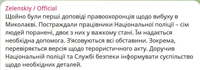 "Щойно були перші доповіді правоохоронців з вибуху в Миколаєві. Постраждали працівники Національної поліції – семеро людей отримали поранення, двоє з них у тяжкому стані. Їм надається необхідна допомога. З'ясовуються всі обставини. Зокрема, перевіряється версія про терористичний акт", – написав Зеленський у своєму телеграм-каналі.