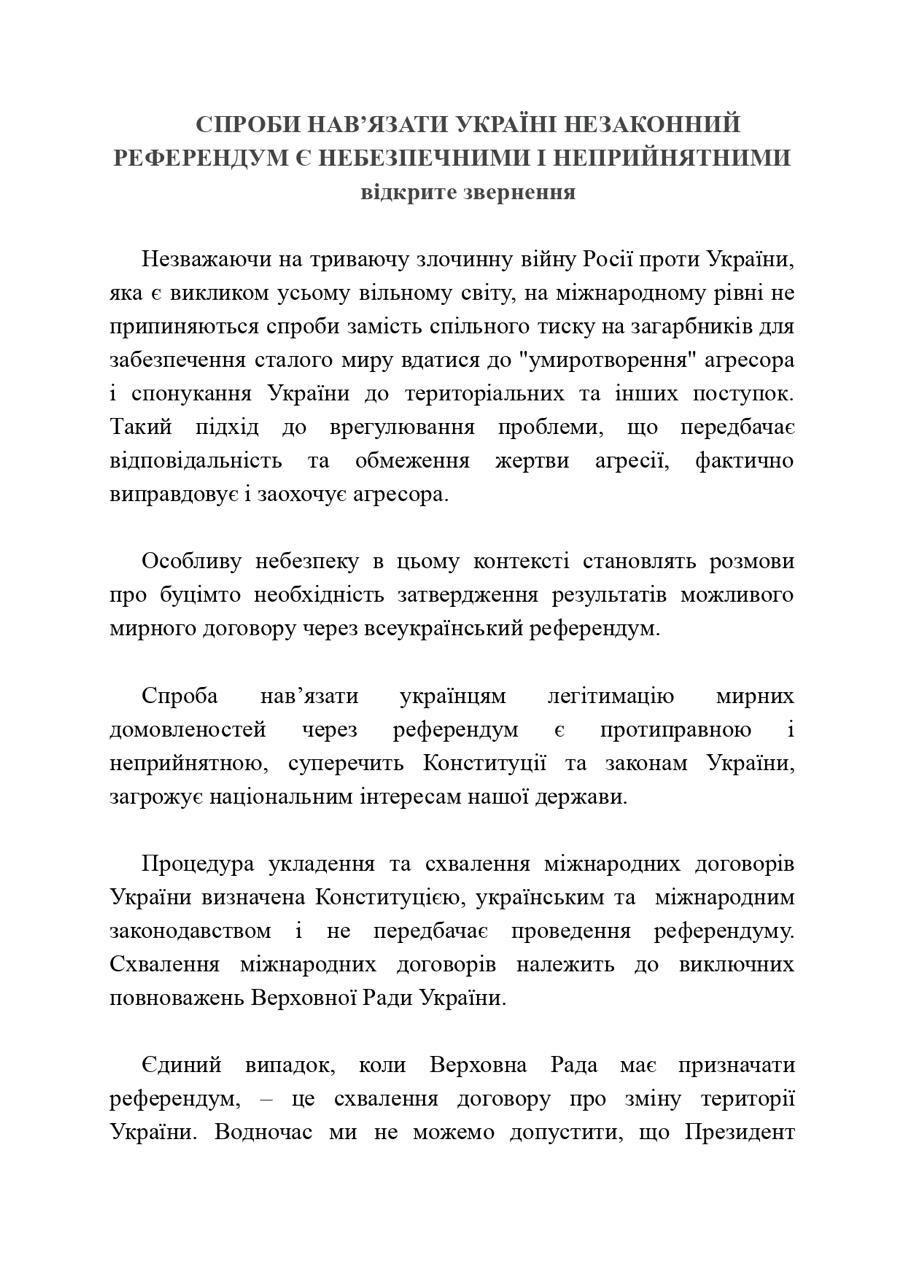 У соціальних мережах поширюють звернення проти "спроб нав'язати Україні незаконний референдум" щодо схвалення мирної угоди.