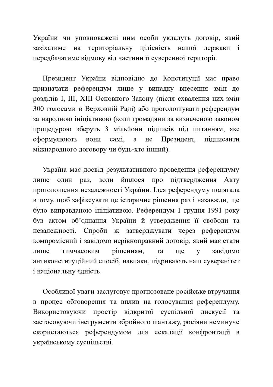 "Єдиний випадок, коли Верховна Рада має призначати референдум - це схвалення договору про зміну території України. Водночас, ми не можемо припустити, що президент України або уповноважені ним особи укладуть договір, який зазіхає на територіальну цілісність нашої держави і передбачає відмову від частини її суверенної території", - йдеться у повідомленні.