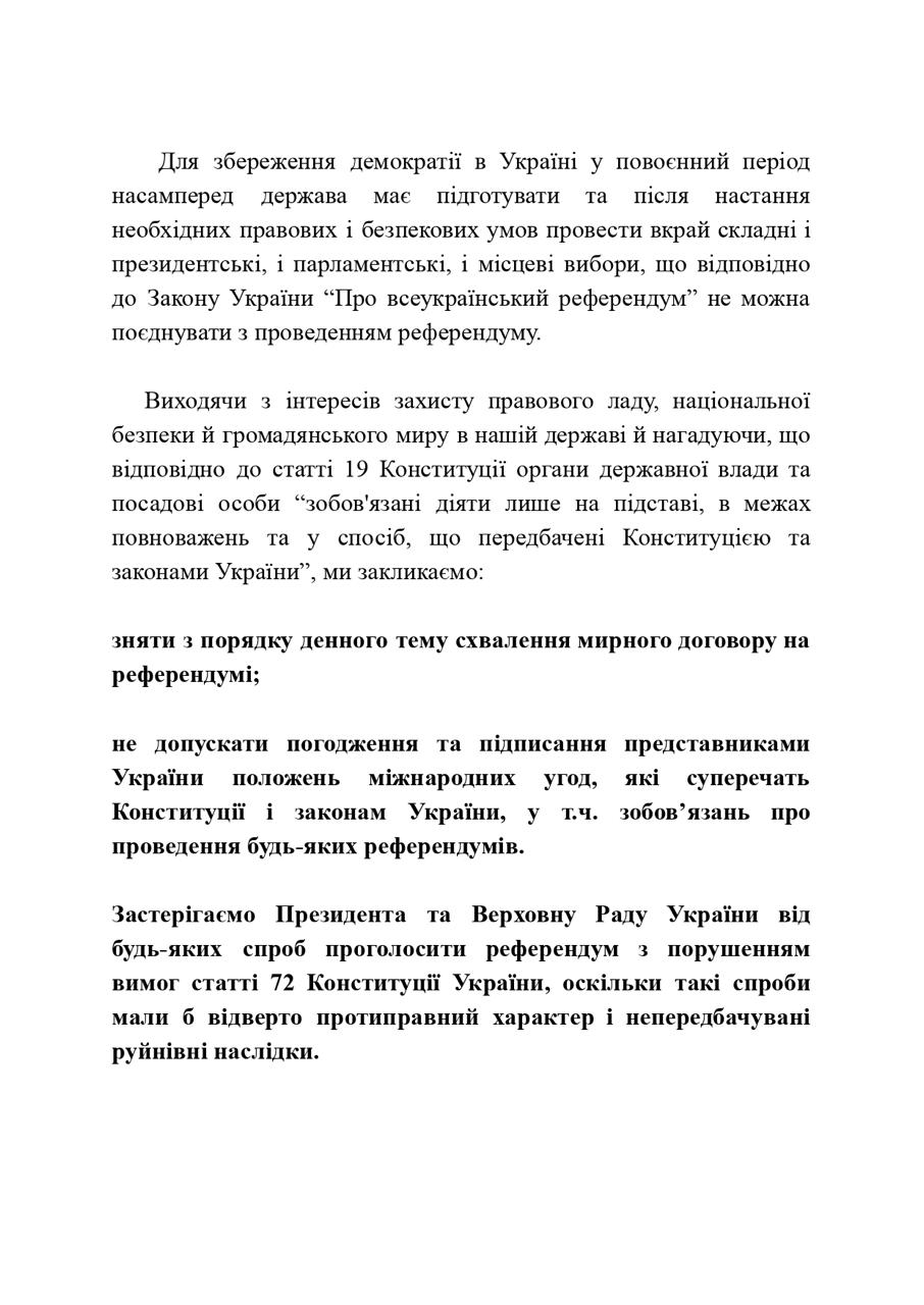 "Застерігаємо Президента та Верховну Раду України від будь-яких спроб проголосити референдум з порушенням вимог статті 72 Конституції України, оскільки такі спроби мали б відверто протиправний характер та непередбачувані руйнівні наслідки", - йдеться у заяві.