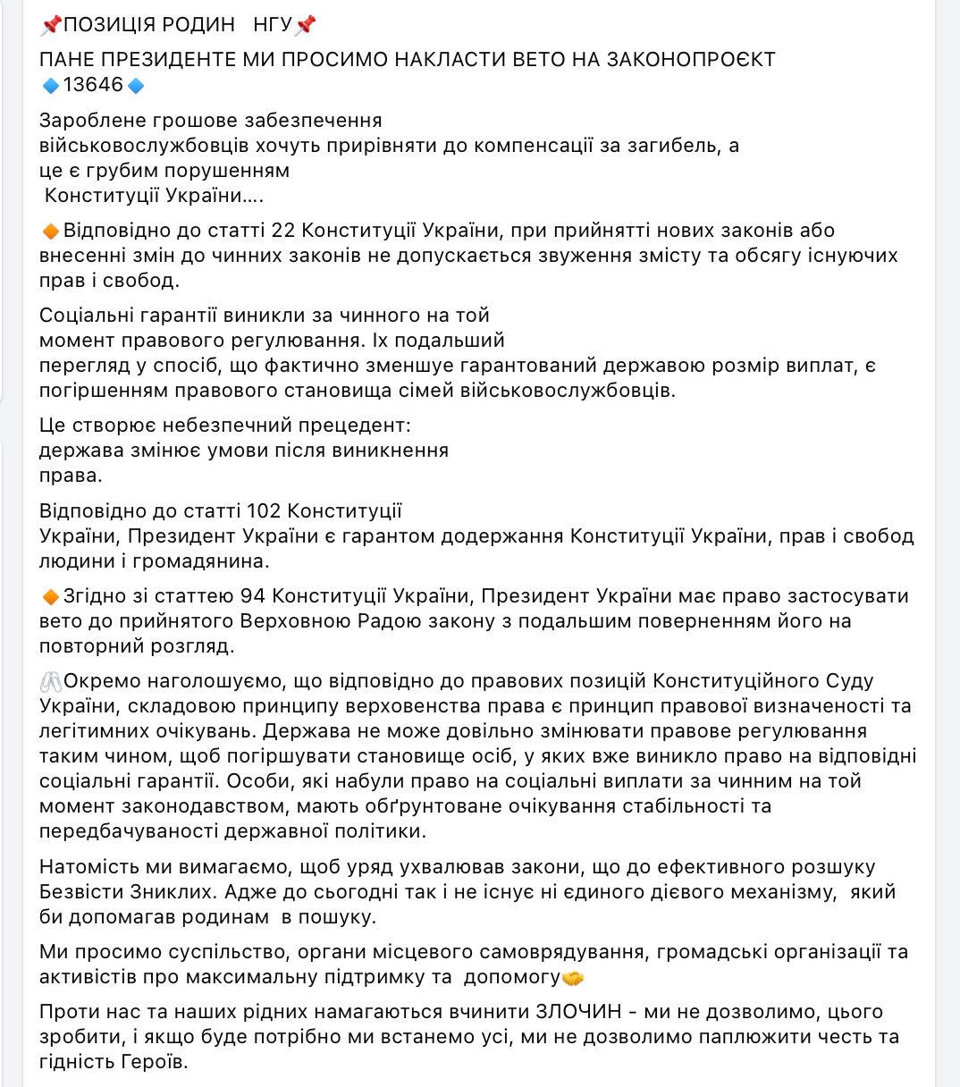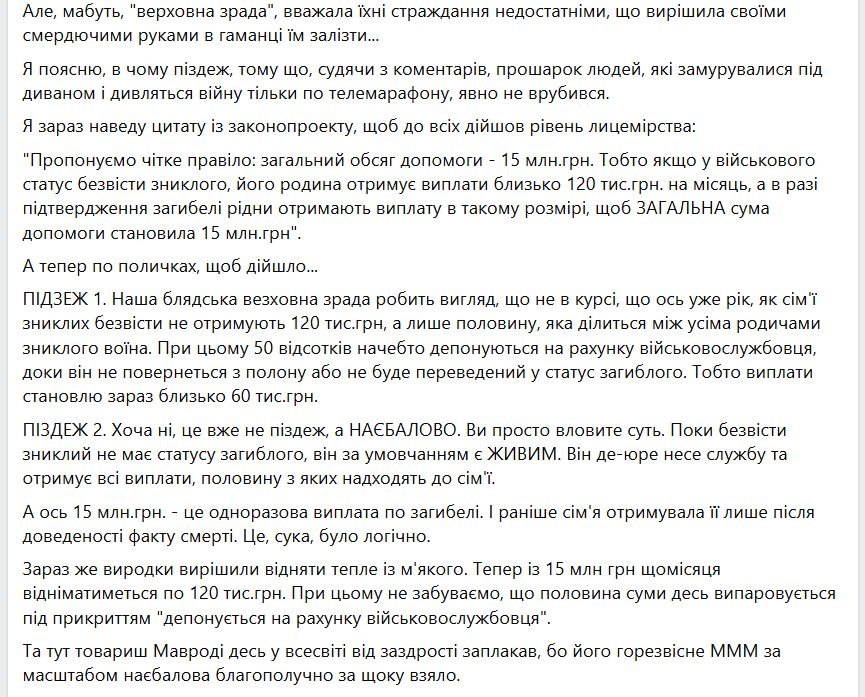 Був закон. Були чіткі умови. Були гарантії сім'ям військовослужбовців. І в момент, коли тисячі сімей вже живуть у невизначеності, ці правила просто змінюють – в односторонньому порядку. Статус сім'ї безвісти зниклого – це не тимчасова історія. Це не “до з'ясування”. Це не пауза на кілька місяців. знать. А государство говорит нам: ждите. Ждите подтверждений. Ждите обмена. Ждите результатов. Хорошо. Но если вы говорите нам ждать, нельзя одновременно урезать те гарантии, которые были даны семьям. Нельзя забирать денежное обеспечение военнослужащего и единовременную помощь, чтобы "оптимизировать бюджет". Это не про экономию. Это про мораль", – говорится в заявлении группы без вести зниклих 150-ї механізованої бригади.