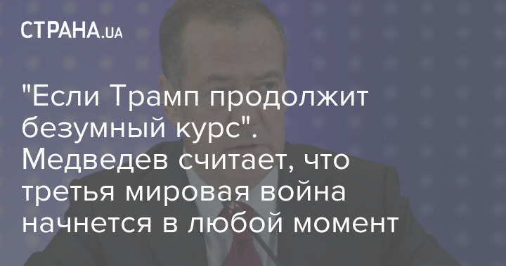"Якщо Трамп продовжить свій божевільний курс зі злочинної зміни політичних режимів, вона (третя світова війна - Ред. ) безсумнівно почнеться. І тригером може стати будь-яка подія. Будь-яка... Це (війна в Ірані - Ред. ) війна США і їх союзників за збереження глобального домінування". Медведєв.