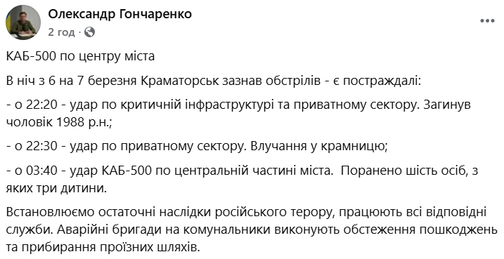 Ще один обстріл стався 7 березня – близько 03:40. Російські війська завдали удару по центральній частині Краматорська авіабомбою КАБ-500.