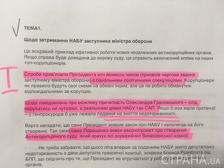 Спекуляция, пишут в документах, и то, что к коррупционному скандалу в Минобороне привязывают депутата от БПП Александра Грановского. "Следует руководствоваться не слухами, а реальными действиями как НАБУ так и САП. Если бы они имели претензии – у генпрокурора бы уже лежало представление на снятие депутатской неприкосновенности", - пишут авторы темников.