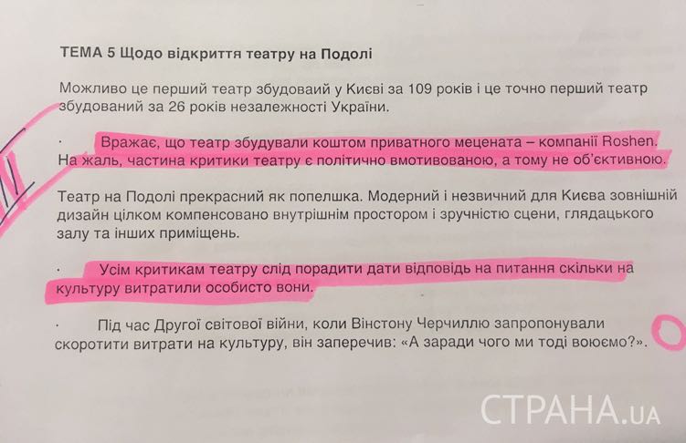 "Поражает, что театр построен за деньги частного мецената – компания Roshen. К сожалению, часть критики театра политически мотивирована, а поэтому – необъективна", - сетуют авторы темников и рекомендуют провластным ЛОМам и спикерам в дискуссии задавать скептикам встречный вопрос: "а сколько на культуру потратили лично они?".