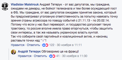 И вот под этим сообщением появилось конкретное предложение от одного из подписчиков не устраивать бойкоты каналов, а принять закон, который бы предусматривал уголовную ответственность за "попытку навязать точку зрения страны-агрессора по поводу событий с 21.11.2013 - по 20.02.14".