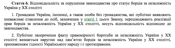В Украине же уже два года действует интересная норма закона "О правовом статусе и уважении памяти борцов за независимость Украины в 20 веке", которая гласит, что унизительное отношение к борцам за независимость Украины в 20 веке (а к ним относятся органы власти УНР, ЗУНР, ОУН, УПА и прочие партизанские отряды), предусматривает ответственность в соответствии с законом.