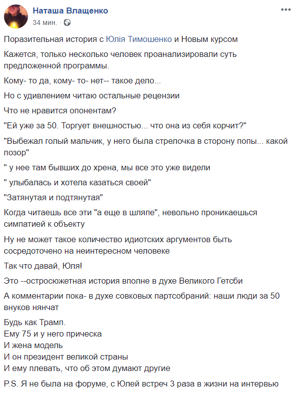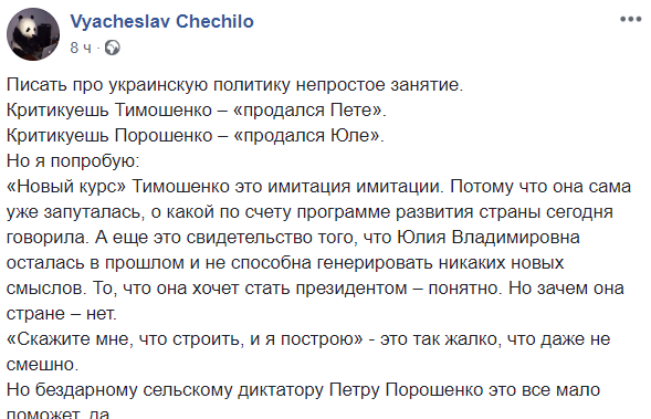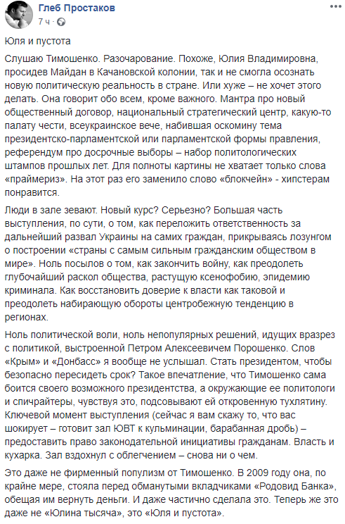 "Слушаю Тимошенко. Разочарование. Похоже, Юлия Владимировна, просидев Майдан в Качановской колонии, так и не смогла осознать новую политическую реальность в стране. Или хуже – не хочет этого делать. Она говорит обо всем, кроме важного. Мантра про новый общественный договор, национальный стратегический центр, какую-то палату чести, всеукраинское вече, набившая оскомину тема президентско-парламентской или парламентской формы правления, референдум про досрочные выборы – набор политологических штампов прошлых лет. Для полноты картины не хватает только слова "праймериз". На этот раз его заменило слово "блокчейн" - хипстерам понравится.