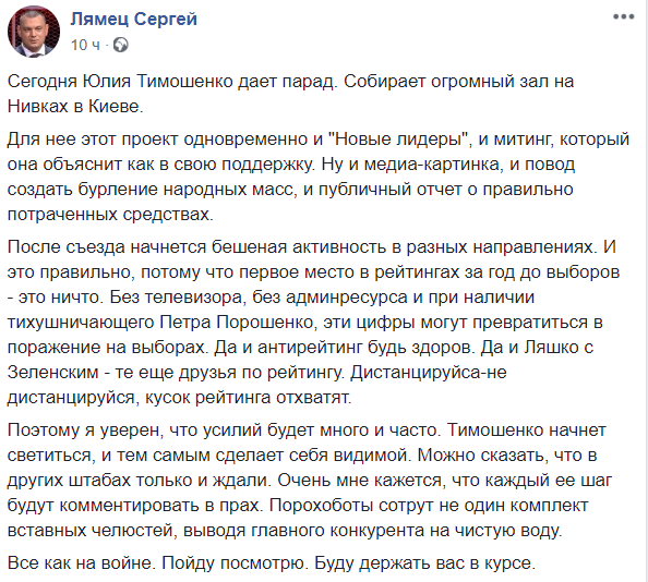 "После съезда начнется бешеная активность в разных направлениях. И это правильно, потому что первое место в рейтингах за год до выборов - это ничто. Без телевизора, без админресурса и при наличии тихушничающего Петра Порошенко, эти цифры могут превратиться в поражение на выборах. Да и антирейтинг будь здоров. Да и Ляшко с Зеленским - те еще друзья по рейтингу. Дистанцируйся-не дистанцируйся, кусок рейтинга отхватят.