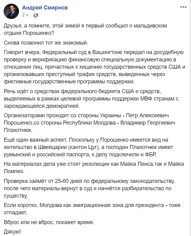 На своей странице в Facebook юрист (со ссылкой на источник, ранее передававший ему достоверные сведения), обнародовал несколько шокирующих данных, касающихся президента Украины Петра Порошенко и едва ли не самого влиятельного человека в Молдове – Владимира Плахотнюка.
