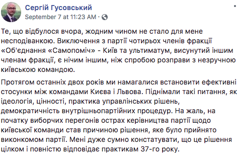 Также на своей странице в Facebook он признался в трениях между львовской и киевской ячейкой "Самопомощи", а "попытку расправы с неудобной киевской командой" сравнил с практиками 37-го года.