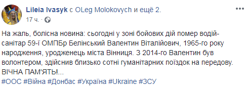 "К сожалению, болезненная новость: сегодня в зоне боевых действий умер водитель-санитар 59-й ОМПБр Белинский Валентин Витальевич, 1965 года рождения, уроженец города Винница. С 2014-го Валентин был волонтером, совершил около сотни гуманитарных поездок на передовую. ВЕЧНАЯ ПАМЯТЬ ...", - указано в опубликованном сообщении.