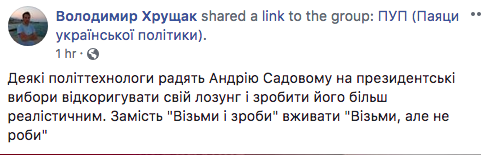 Впрочем, критически настроенные львовяне смеются, что давнее "гасло" Садового должно звучать "Візьми, але не роби".