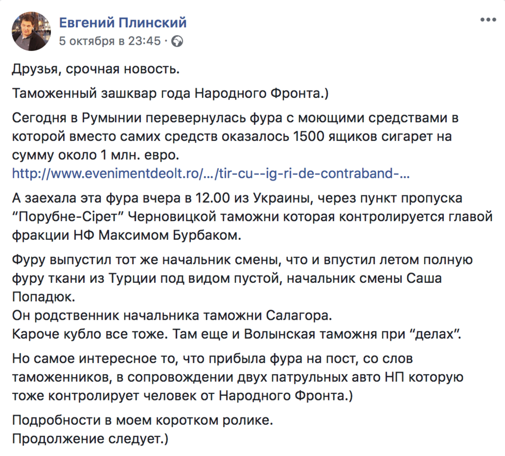 "Фуру выпустил тот же начальник смены, что и впустил летом полную фуру ткани из Турции под видом пустой, начальник смены Саша Попадюк. Он родственник начальника таможни Салагора. Короче, кубло все то же. Там еще и Волынская таможня при "делах", - пишет Плинский.