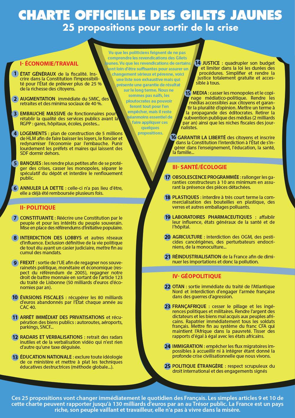 На четвертой неделе протестов появился некий список из 25 требований к правительству, который репостят в соцсетях. Опрошенные нами "жилетки" и французские журналисты говорят, что это неофициальный манифест, авторство его неизвестно.