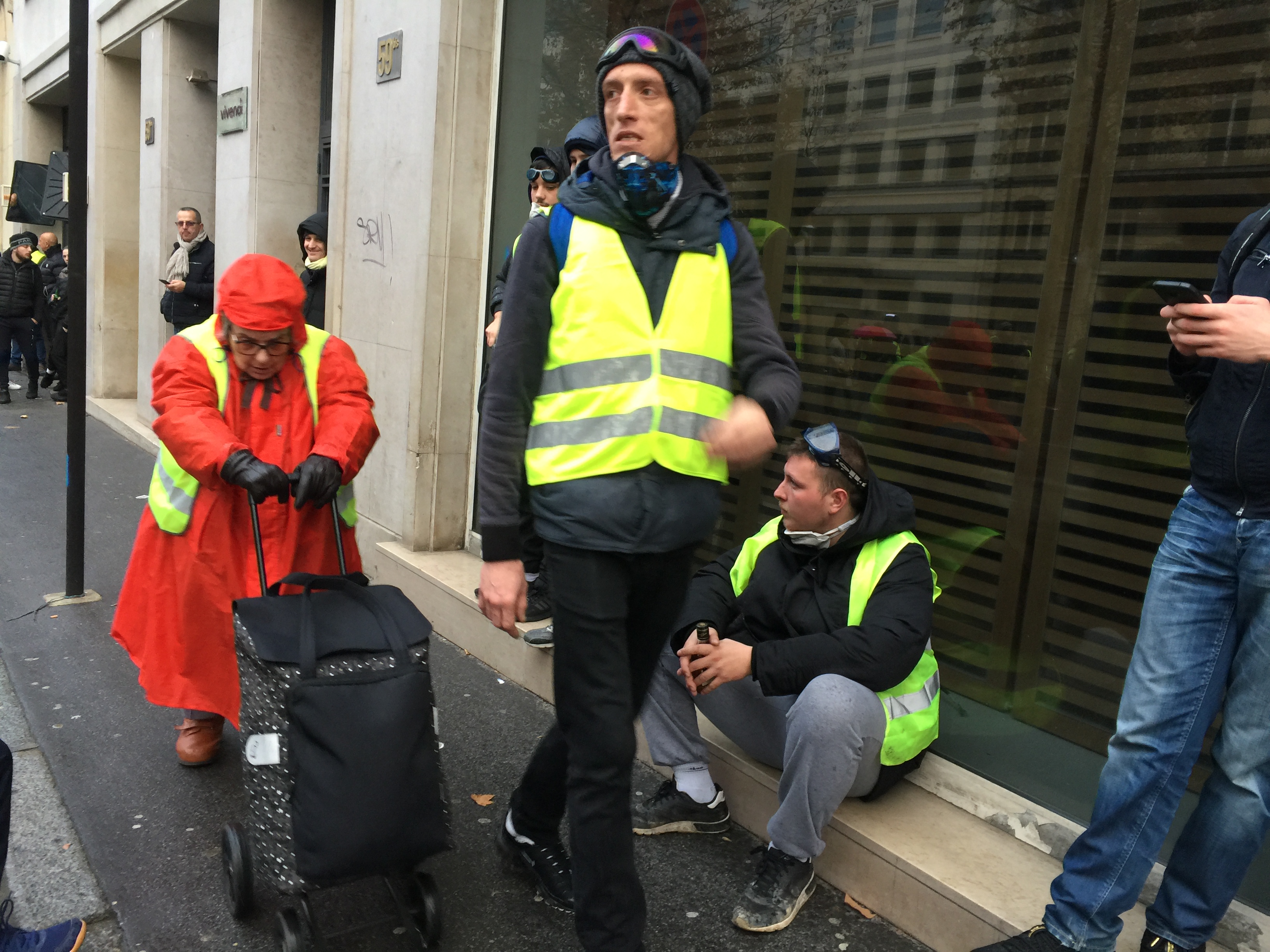 Протестный контингент – разношерстный. Большая часть – это молодые мужчины, работяги 20-40 лет. Мелькали и дамы, многие из которых просто пришли за компанию с бойфрендами и мужьями. На две трети это коренные французы, но есть и мигранты (арабы, темнокожие). В "желтожилетной" толпе попадались пестрые колоритные персонажи – дедушки в стиле хиппи с длинными бородами, ухоженные пожилые мадам субтильного телосложения с пирсингом, цепочками на лодыжках и в туфлях на каблуках на босу ногу (внешне из-за худощавости напоминают жену Макрона, 65-летнюю Бриджит), и просто старушки с сумками на колесиках, с которыми наши бабушки ходят на базар.