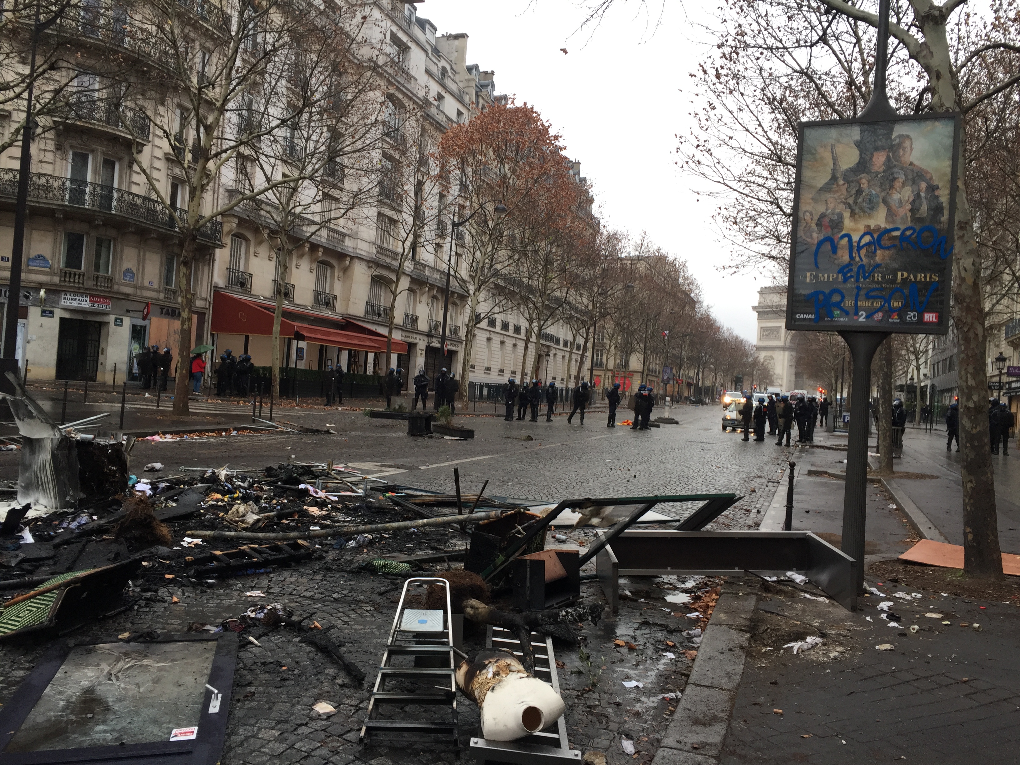 "Макрона в тюрьму" пишут протестующие на транспарантах, домах и ситилайтах. На мостовой – сгоревшие остатки мебели из разгромленного ресторана "Мари-Сюзи" на прилегающей к Елисейским полям улице. Фото: "Страна"