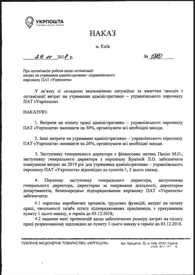 В распоряжение "Страны" попало распоряжение главы "Укрпочты" в котором идет речь об урезании зарплат персоналу.