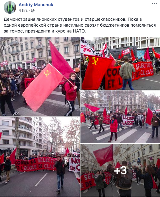 "Демонстрация лионских студентов и старшеклассников. Пока в одной европейской стране насильно свозят бюджетников помолиться за томос, президента и курс на НАТО", - подписал журналист Андрей Манчук фото с шествия на своей странице в Facebook.