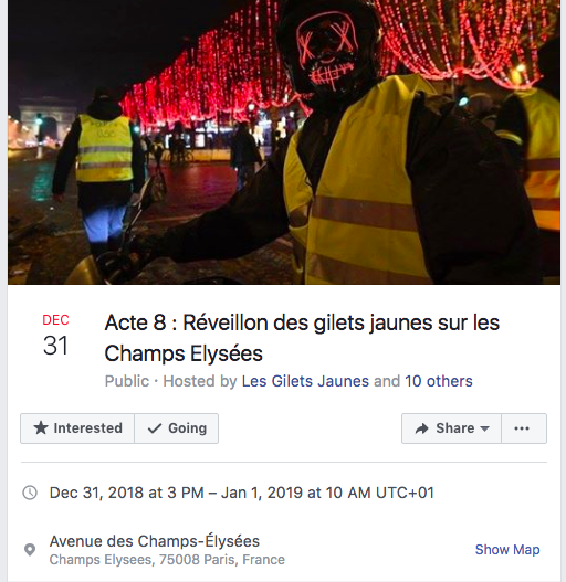 "Потому что мы никогда не сдадимся. Потому что Елисейские Поля стали нашим новым садом борьбы. Мы снова встретимся 31 декабря на полях, чтобы вместе отпраздновать приход 2019 года, в радости и в ненасильственной борьбе", - написали организаторы на странице события в Facebook.