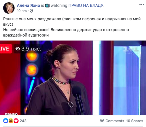 "Раньше она меня раздражала (слишком пафосная и надрывная на мой вкус). Но сейчас восхищаюсь! Великолепно держит удар в откровенно враждебной аудитории", - поддержала пятый номер "ЕС" киевская журналистка Алена Яхно.