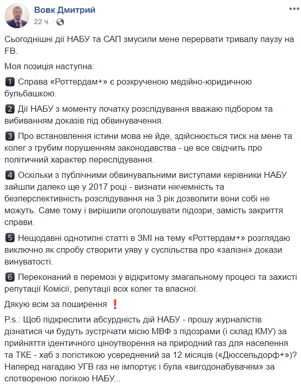 "Дело "Роттердам+" является раскрученным медийно-юридическим пузырем. Действия НАБУ с момента начала расследования считаю подбором и выбиванием доказательств под обвинение. Об установлении истины речь не идет: осуществляется давление на меня и коллег с грубым нарушением законодательства – это все свидетельствует о политическом характере преследования. Поскольку с публичными обвинительными выступлениями руководители НАБУ зашли далеко еще в 2017 году – признать ничтожность и бесперспективность расследования на третий год позволить себе они не могут. Именно поэтому решили объявлять о подозрении вместо закрытия дела, – подчеркнул экс-глава НКРЭКУ. – Уверен в победе в открытом состязательном процессе и защите репутации Комиссии, всех коллег и собственной", – заявил Вовк.