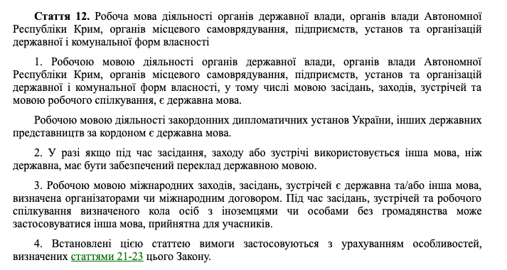 Более того, ч.2 ст. 12 нового закона о функционировании украинского языка позволяет использовать в работе органов власти другие языки, отмечая, что должен быть обеспечен перевод на украинский язык.