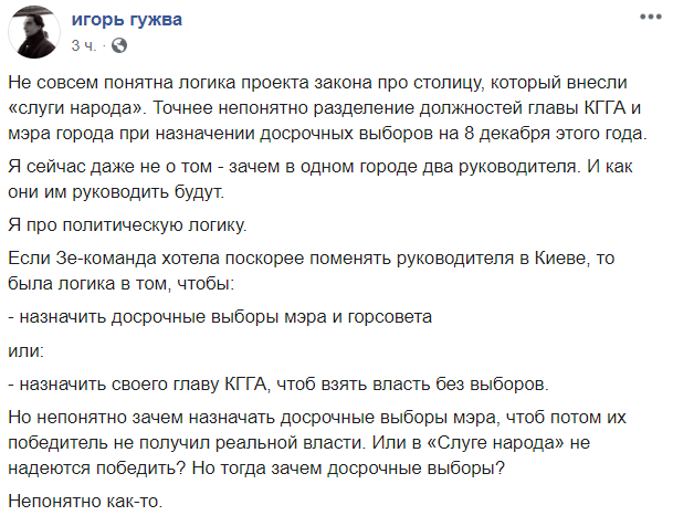 "Не совсем понятна логика проекта закона про столицу, который внесли "слуги народа". Точнее непонятно разделение должностей главы КГГА и мэра города при назначении досрочных выборов на 8 декабря этого года.