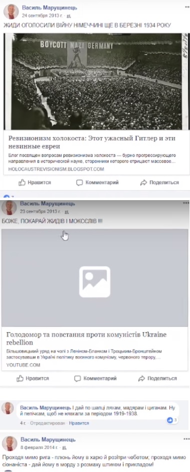 63-летний Марушинец "прославился" фото с тортом к своему 60-летию в виде автобиографической книги Гитлера Mein Kampf, постами против "ж@дов", перепостами чужих материалов, в которых оправдывается Холокост и события в Бабьем Яру, призывами отвоевать территории у Польши и Венгрии.