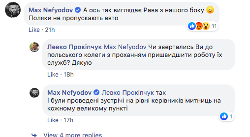 Глава таможенной службы Макс Нефедов в комментариях в Facebook однако пишет, что якобы виновата польская сторона, которая не пропускает авто.
