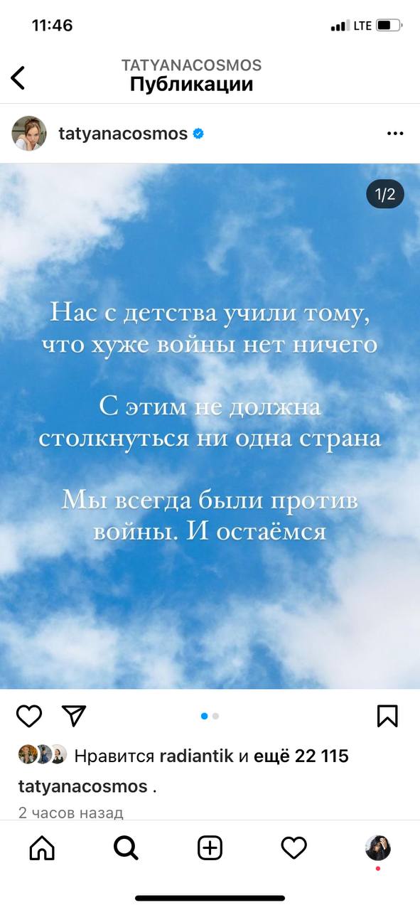 "Как больно… Мы не хотели войны и не звали ее в свой дом! Мы хотим жить, любить и творить мирно! Нам не нужна война!  Я никогда не делила аудиторию на города и страны, но сейчас..я надеюсь, вы слышите меня, россияне, моя аудитория, друзья и поклонники??? Только вместе мы сможем все это остановить! И я верю, что сможем!