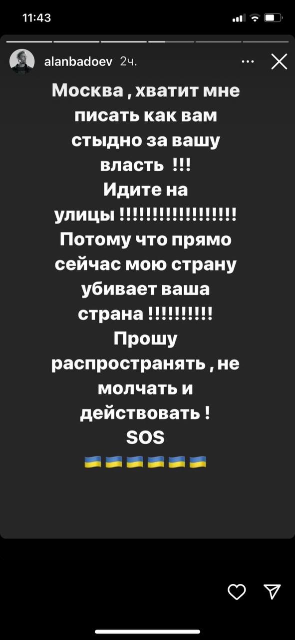В Инстаграм-сторис Алан Бадоев также призвал россиян выходить на улицы и протестовать против войны.