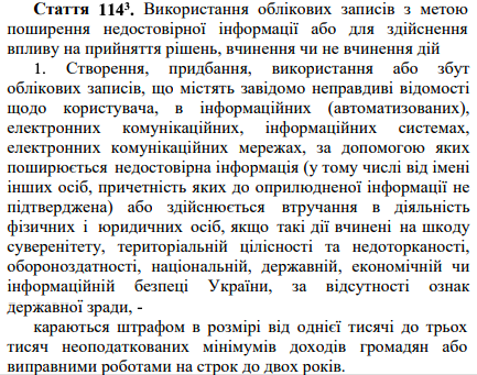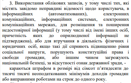То есть если любой пользователь использует свою учетную запись, чтобы разместить или распространить недостоверную информацию или для вмешательства в деятельность физических и юридических лиц, если такие действия способствуют повышению уровня социального напряжения, нарушают конституционные права и свободы граждан или другим образом угрожают национальной безопасности, при отсутствии признаков госизмены, - этому пользователю грозит штраф от 12750 грн до 17000 гривен или исправительные работы на срок до 1 года.