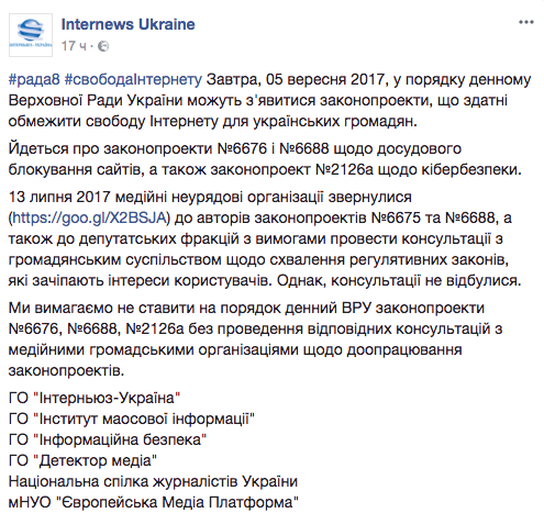 Глава Национального совета журналистов Украины Сергей Томиленко заявил, что этот законопроект, по сути, объявляет войну интернет-пространству.