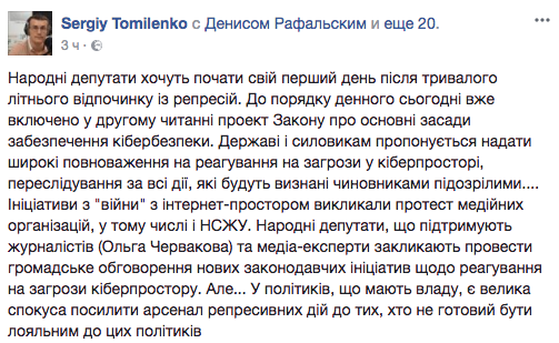 "Государству и силовикам предлагается предоставить широкие полномочия для реагирования на угрозы в киберпространстве, преследования за все действия, которые будут признаны чиновниками подозрительными. Инициативы по "войне" с интернет-пространством вызвали протест медийных организаций, в том числе и НСЖУ. Народные депутаты, поддерживающие журналистов (Ольга Червакова) и медиа-эксперты призывают провести общественное обсуждение новых законодательных инициатив по реагированию на угрозы киберпространства. Но ... У политиков, имеющих власть, есть большой соблазн усилить арсенал репрессивных действий к тем, кто не готов быть лояльным к этим политикам", - написал Томиленко на своей странице в Facebook.