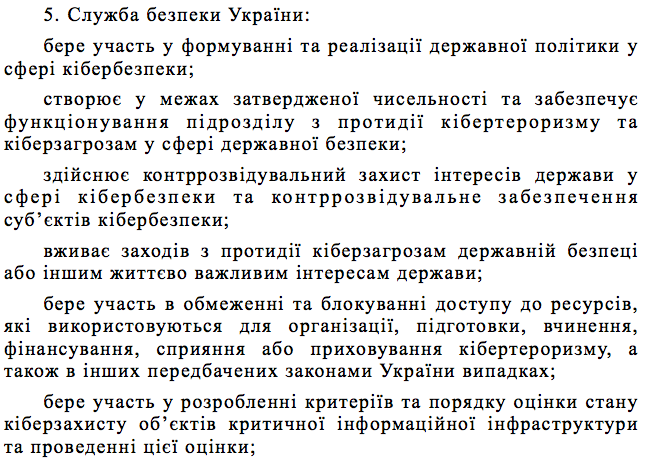 Также обращает на себя внимание пункт, по которому СБУ принимает участие в "ограничении и блокировании доступа к ресурсам", которые причастны к кибертерроризму. С учетом размытости формулировок под "причастность" можно подвести довольно широкий круг "ресурсов", включая средства массовой информации.