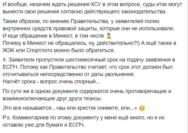 "Очевидно стремление ввести в заблуждение ЕСПЧ: на белое - говорят черное, и наоборот. При таких подходах, у адвокатов по делам ЕСПЧ работа будет всегда и ее будет много... Выход один: ввести регрессную материальную ответственность лиц (чиновников, судей и т.д.) за незаконные решения, которые отменены ЕСПЧ... Да, сначала отвечает государство Украина, но потом - конкретные нарушители прав человека. Иначе - произвол не будет иметь конца-края", - полагает он.